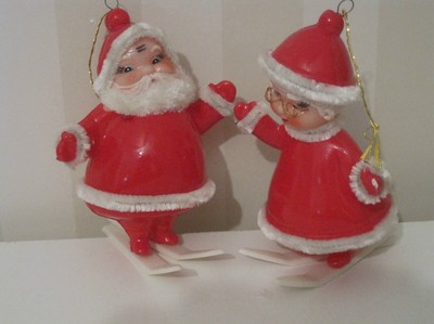 Vintage JAPAN plastic Christmas ornaments Santa and Mrs. Claus on ski's