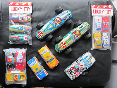 Title (ebay affiliate link): VINTAGE LOT OF 15 1950-60'S GULF,STP,CHAMPION TIN RACE CARS W/ POLICE RESCUE ETC