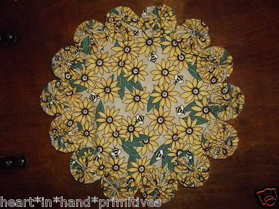 Title (ebay affiliate link): Primitive Spring Black Eyed Susie Honey Bee Yo Yo Candle Mat Penny Rug