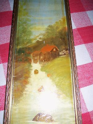 Title (ebay affiliate link): Old Primitive Little Oil Painting of Log Cabin Dated 1924.