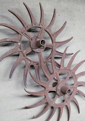 2 old farm rusty implement rotary hoe wheel garden art metalworking
