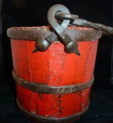 Title (ebay affiliate link): ANTIQUE RED WOODEN BUCKET~BANDED WROUGHT IRON