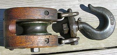 Title (ebay affiliate link): ANTIQUE WOOD AND CAST IRON PULLEY THAT OPENES AT HOOK END-LOOK !