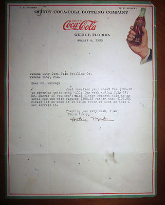 Title (ebay affiliate link): 1933 Quincy Coca Cola Bottling Quincy Florida Letterhead Hand Holding The Bottle