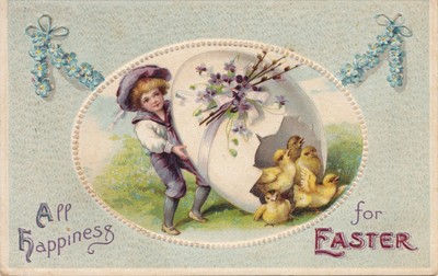 Title (ebay affiliate link): 1300~Vintage Easter Postcard~1910~Boy~Egg Shell~Chicks~Flowers~Floral~No. 2020~E
