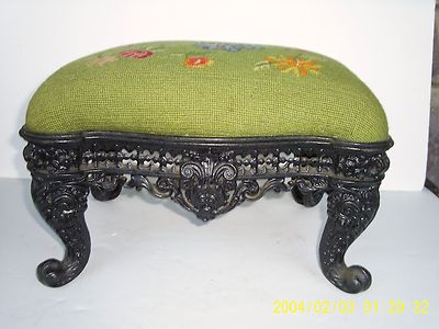 Title (ebay affiliate link): ANTIQUE 1910 CAST IRON FOOT STOOL WITH EMBROIDERED FLOWER CUSHION