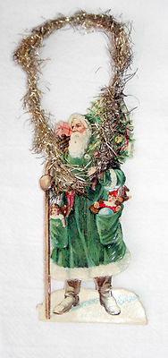 Title (ebay affiliate link): GREEN COATED SANTA CLAUS. Late 1890s Paper & Tinsel German Xmas Ornament.