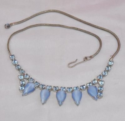 Vtg Moonstone Rhinestone Milk Glass Silvertone Necklace