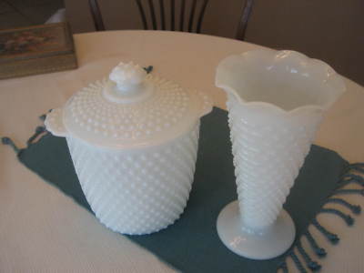 Vintage Hobnail Milk Glass Vase & Canister w/lid