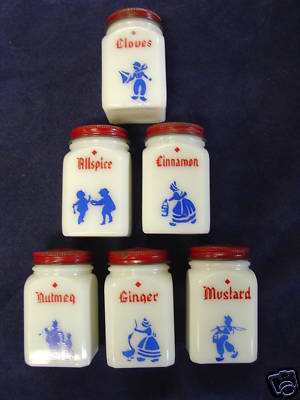 6-MCKEE/TIPP CITY MILK GLASS SPICE JARS/SHAKERS DUTCH