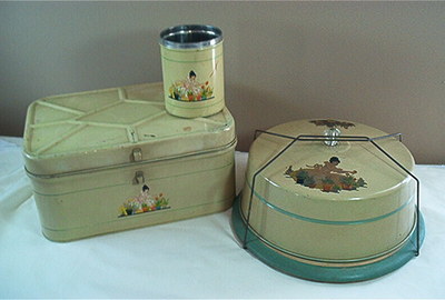 3 Pc Vtg 40's Green Cream Cake Saver Breadbox Metal Sugar can Lady Garden decor