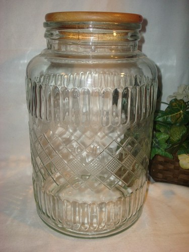 Title (ebay affiliate link): Large Apothecary Jar Embossed Design Glass 12" Tall Wood Lid