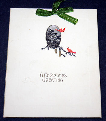 Title (ebay affiliate link): Red Cardinals in Gray Bough themed Bi-fold Christmas Card. Germany. Satin Ribbon