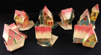 Title (ebay affiliate link): 7 RETRO GLITTER CHRISTMAS HOUSES FOR TREE OR PUTZ
