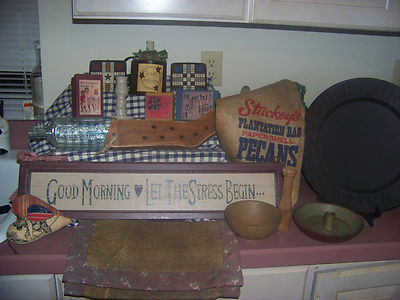 Title (ebay affiliate link): HUGE PRIMITIVE COUNTRY DECOR LOT 17 PIECES GREAT ITEMS MASHER SIGN TABLE RUNNER