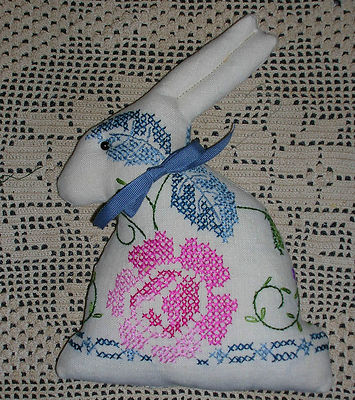 Title (ebay affiliate link): Primitive Vintage Cross Stitch Bunny Rabbit Pillow Basket Filler Spring Easter
