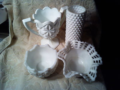 Title (ebay affiliate link): 4 asst.patterns of milkglass 2 Westmoreland Old Quilt & Hobnail- 2 unknown mkr.