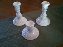 3 beautiful milk glass hobnail candlestick holders.