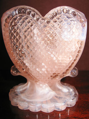 Title (ebay affiliate link): Pink and white milk slag glass tabletop toothpick holder Heart pattern match art