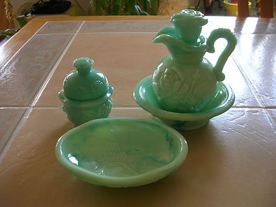 Title (ebay affiliate link): VINTAGE AVON BATH VANITY GREEN BLUE SLAG GLASS MILK PITCHER SOAP DISH & POWDER