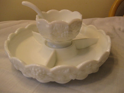Title (ebay affiliate link): Westmoreland Milk Glass Paneled Grape 3pc Appetizer Set Divided Dish Spoon Bowl