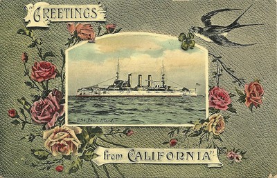 Poscard Greetings from California 1908 Visit"Great White Fleet" USS Rhode Island