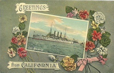 Poscard Greetings from California 1908 Visit"Great White Fleet" USS New Jersey