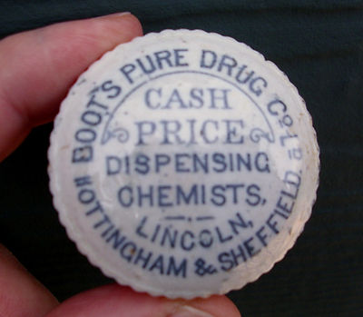 Antique, ceramic, Boots' Chemist's, tri-city pharmacy pot lid