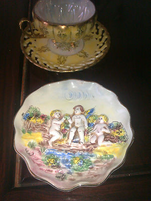 A vintage ceramic R. Capodimonte dish with cherubs & a Royal Sealy cup & saucer