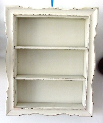 vntg. Chic Off White DISTRESSED shabby ORNATE Wall Curio Shelf Cabinet bed/bath