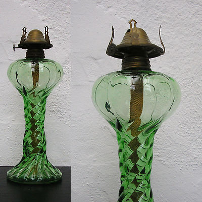 Antique Emerald Green Art Nouveau Oil Lamp wrythen twist glass font c1890-1910