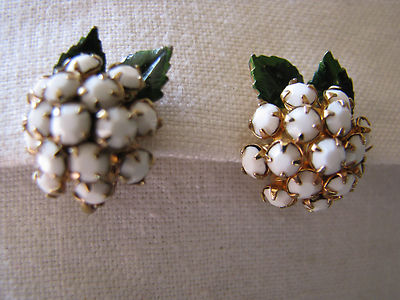 Title (ebay affiliate link): VINTAGE WHITE MILK GLASS GREEN ENAMEL LEAVES GOLDTONE CLIP-ON EARRINGS
