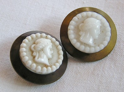 Pair Old Cameo Portrait Milk Glass & Brass Sewing or Craft Button, 1 1/8"