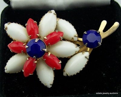 Title (ebay affiliate link): Vintage Brooch Rhinestone Blue Red White Milk Glass Flower Gold tone Jewelry - P