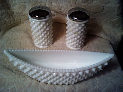 Title (ebay affiliate link): Fenton milkglass Hobnail pair of salt & pepper SHAKERS & Crescent PLANTER
