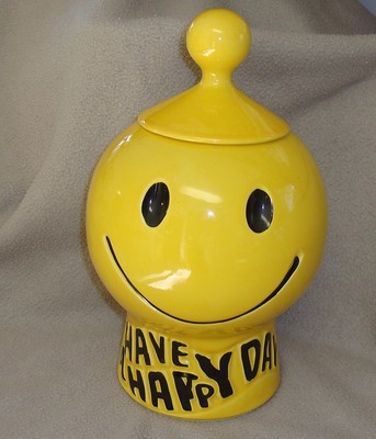 Title (ebay affiliate link): MCCOY HAVE A HAPPY DAY SMILEY FACE YELLOW COOKIE JAR vintage 70's kitsch decor
