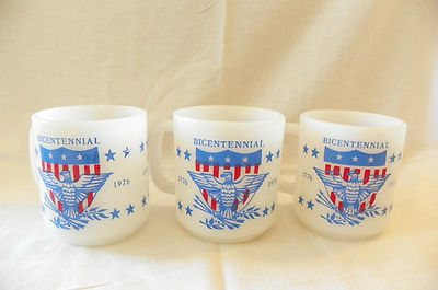 Title (ebay affiliate link): Set of THREE Glasbake Milk Glass Coffee Mugs Bicentennial 1776-1976 Eagle Stripe