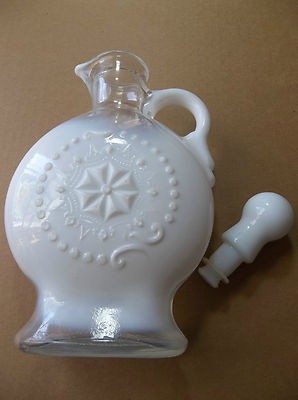 Title (ebay affiliate link): Vtg JIM BEAM Opalescent Clear White Milk Glass Bottle w/ Stopper 1957 Decanter
