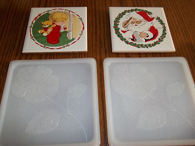 Title (ebay affiliate link): Set of 2 Vintage White Milk Glass Floral Trivets And 2 Christmas Santa can hang