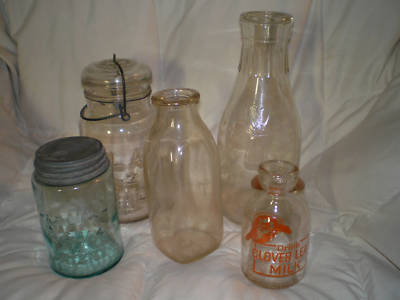 VINTAGE MASON JARS (2) & MILK BOTTLES (3)