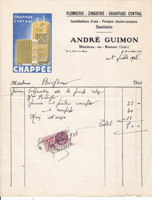 OLD FRENCH DOCUMENT - 1938 INVOICE, CENTRAL HEATING