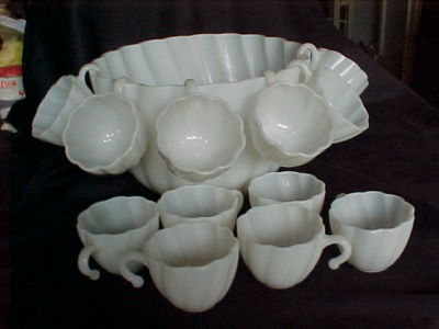 PUNCH BOWL AND 12 CUPS WHITE SWIRL MILK GLASS