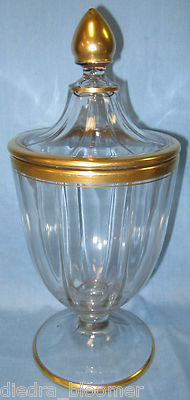 Vintage Elegant Glass Candy Compote Dish Lid Gold Trim Stemmed Paneled Heisey ?