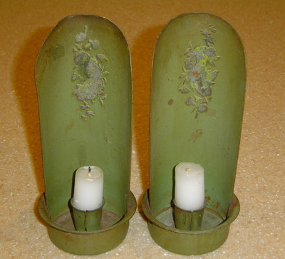 Title (ebay affiliate link): Vintage Green Tin Metal Wall Candle Sconce Pair Toleware Candleholders Original