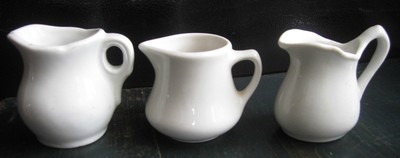 ANTIQUE WHITE IRONSTONE -3 MINIATURE PITCHERS - VINTAGE POTTERY OLD PITCHER NR