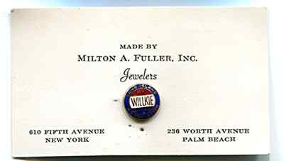WILLKIE POLITICAL BUTTON ON MAKERS CARD- MILTON A. FULLER, INC.JEWELERS