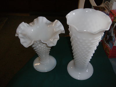 2 WHITE MILKGLASS HOBNAIL DESIGN LARGE VASES NICE!!!