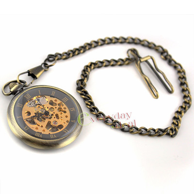 Antique Steampunk Pocket Watch Gold Mechanical Skeleton Clock Transparent Chain