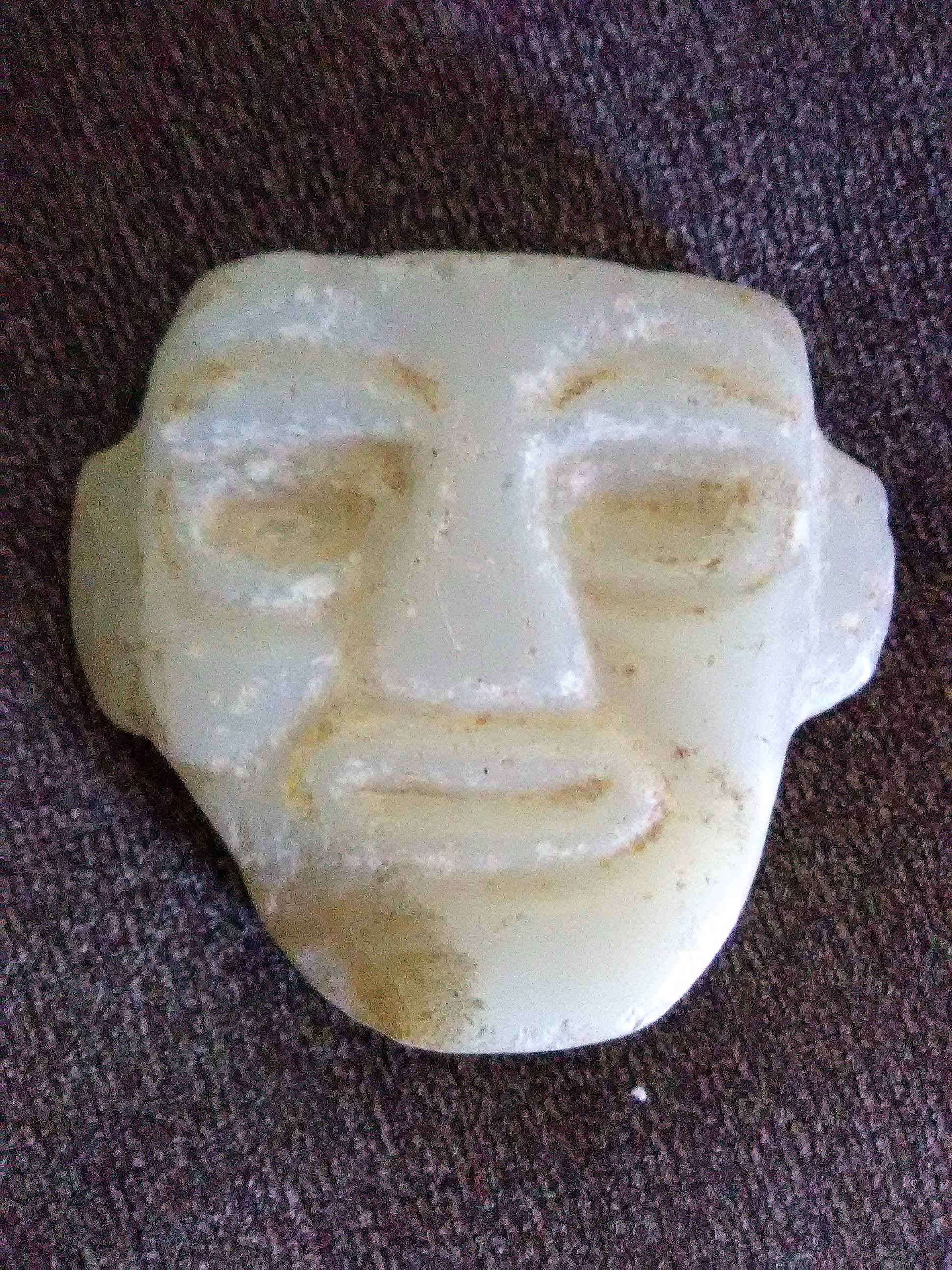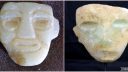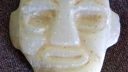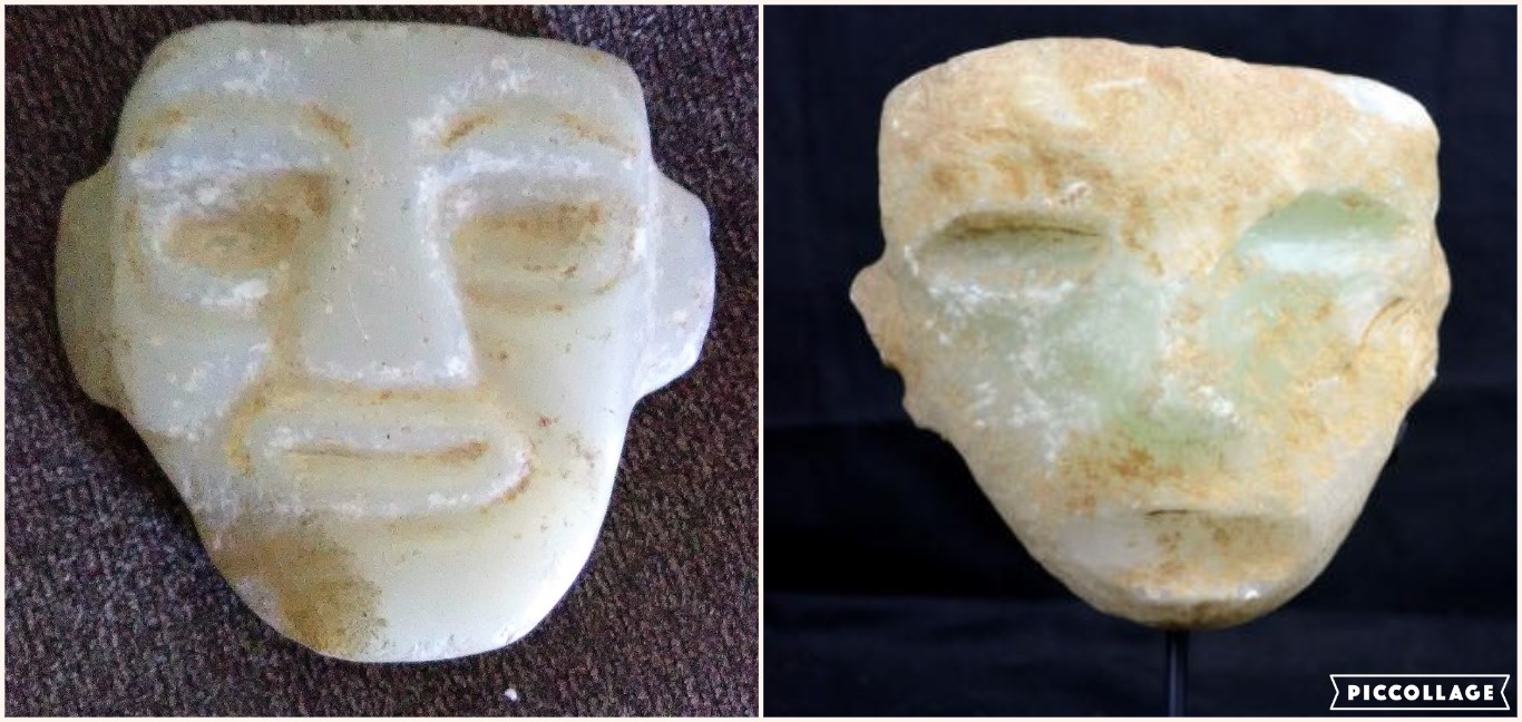 Ancient or not Mayan carved stone face. Saw a simular one in an Arizona museam online. Please help identify this item if possible demensions are 5 1/2 ” by 5″, an inch and a half thick, weighs about 3 1/2 pounds. light greenish and marbled white. We are so curious as to what this is. Images with faces side by side are left ours right is museum