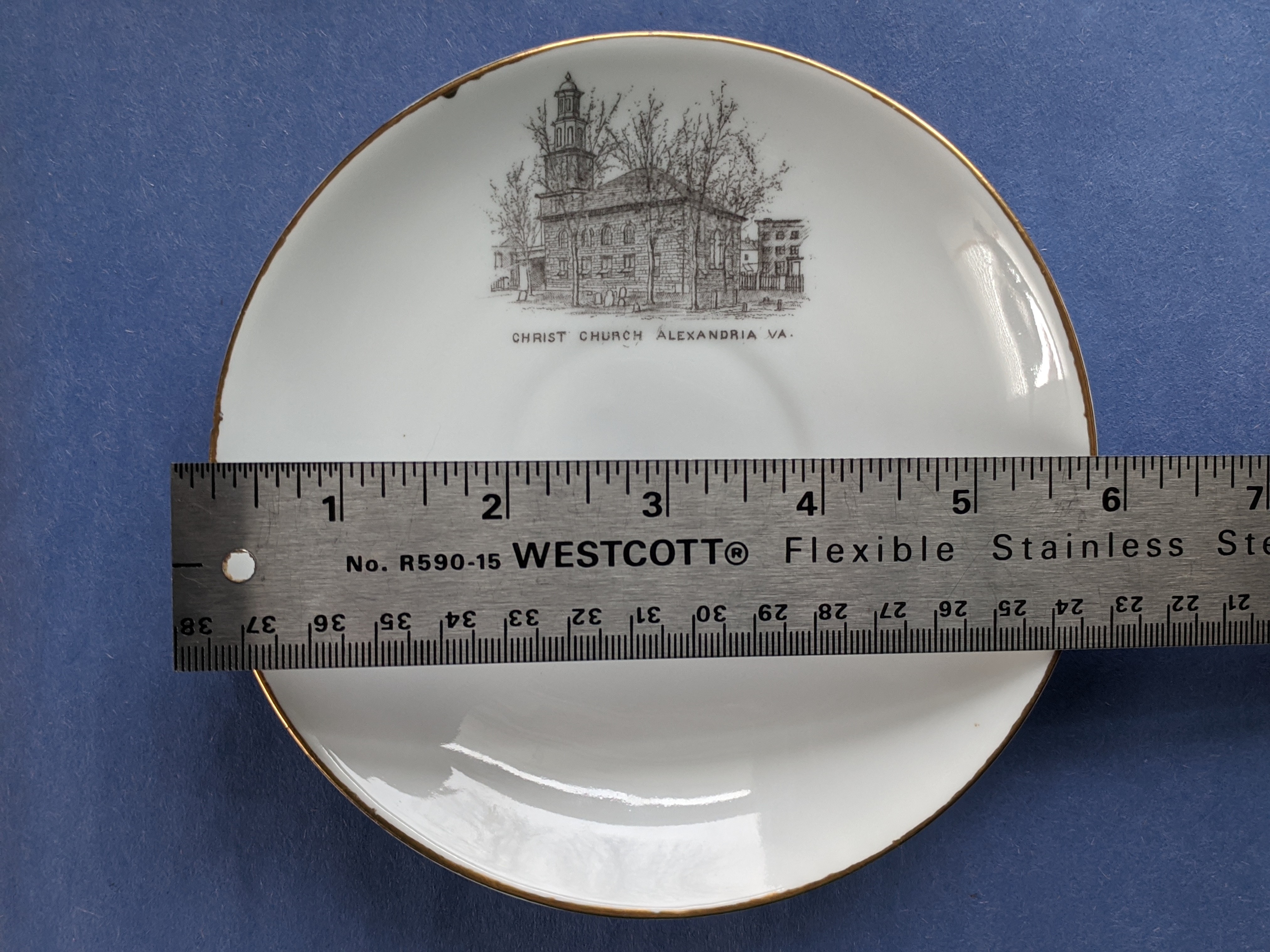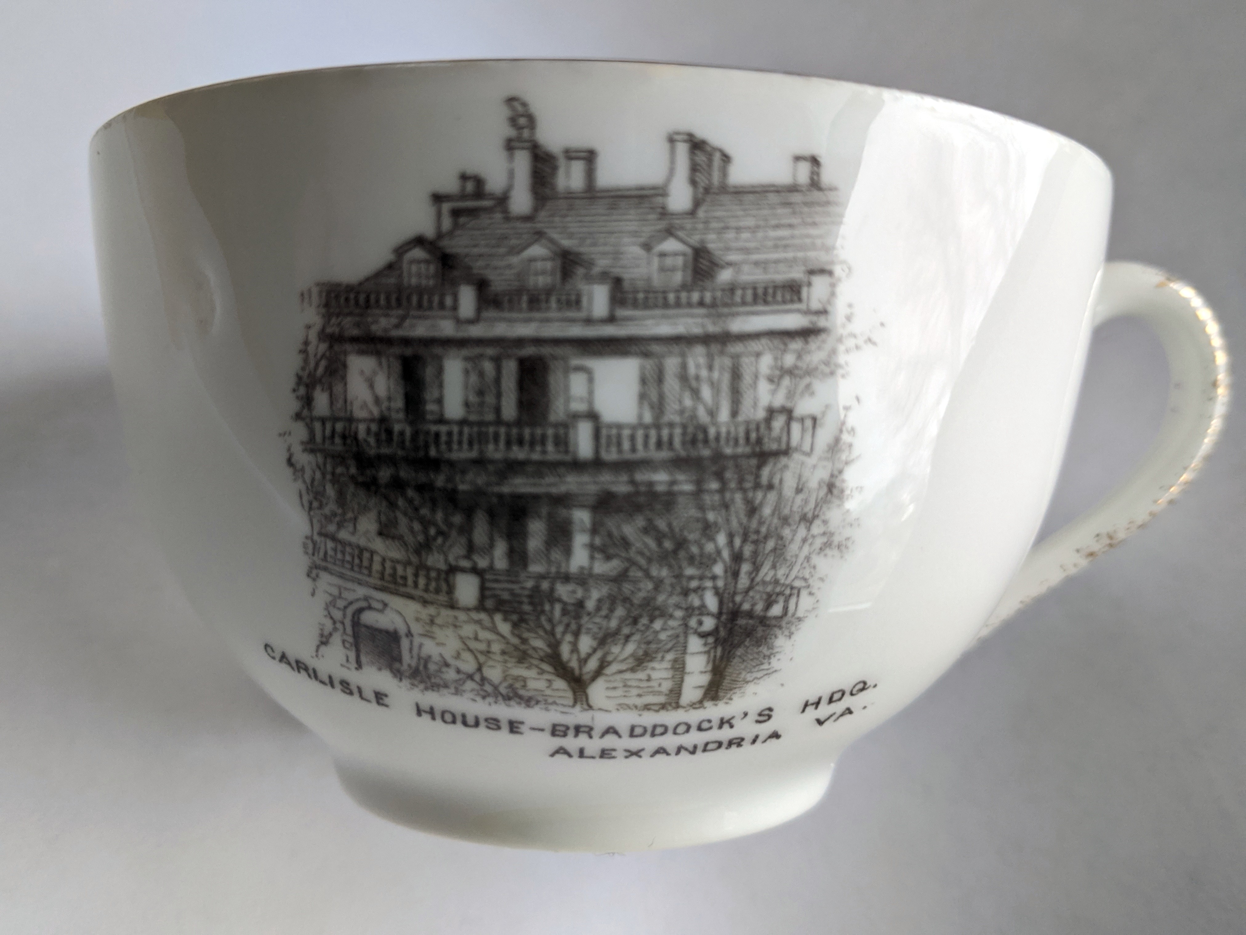 The cup has the historic Carlisle House, Braddock’s HDQ. on it and the saucer has the historic Christ Church on it. I plan on selling them to the Carlyle House or the Alexandria Museum. They would like them, but I’m unsure as to their value.